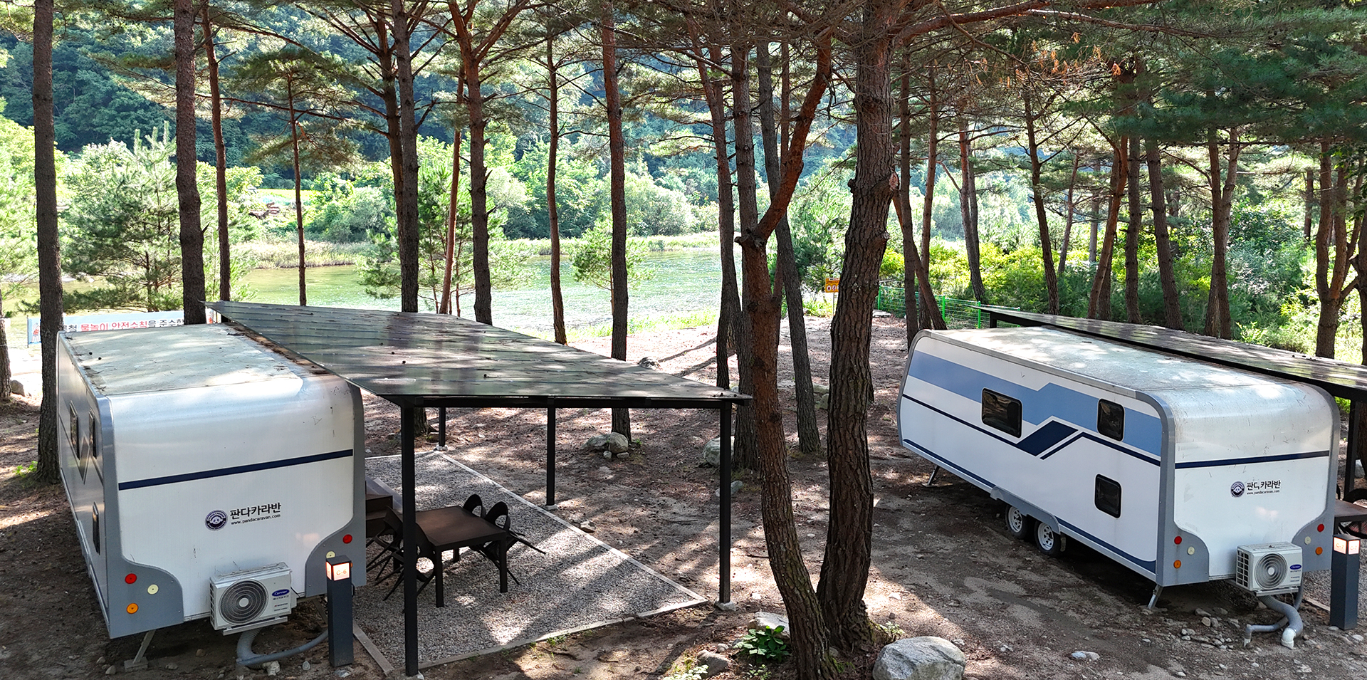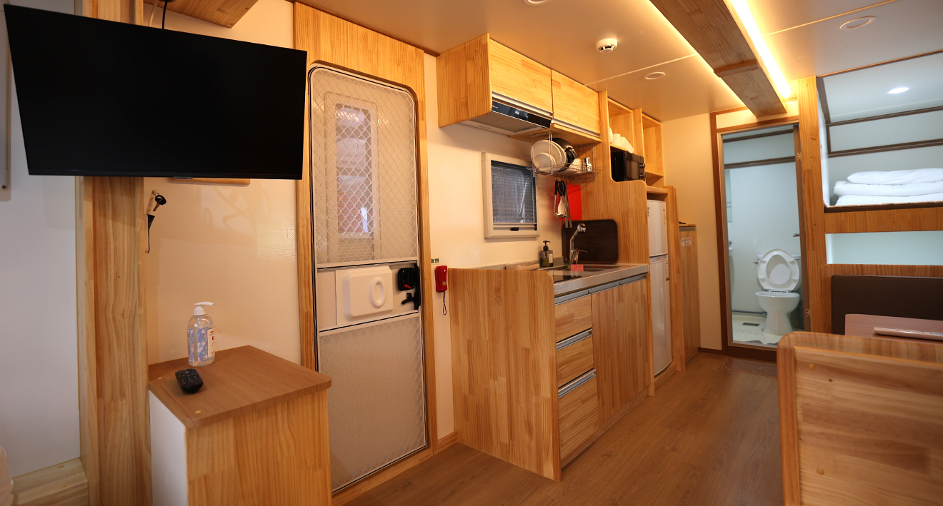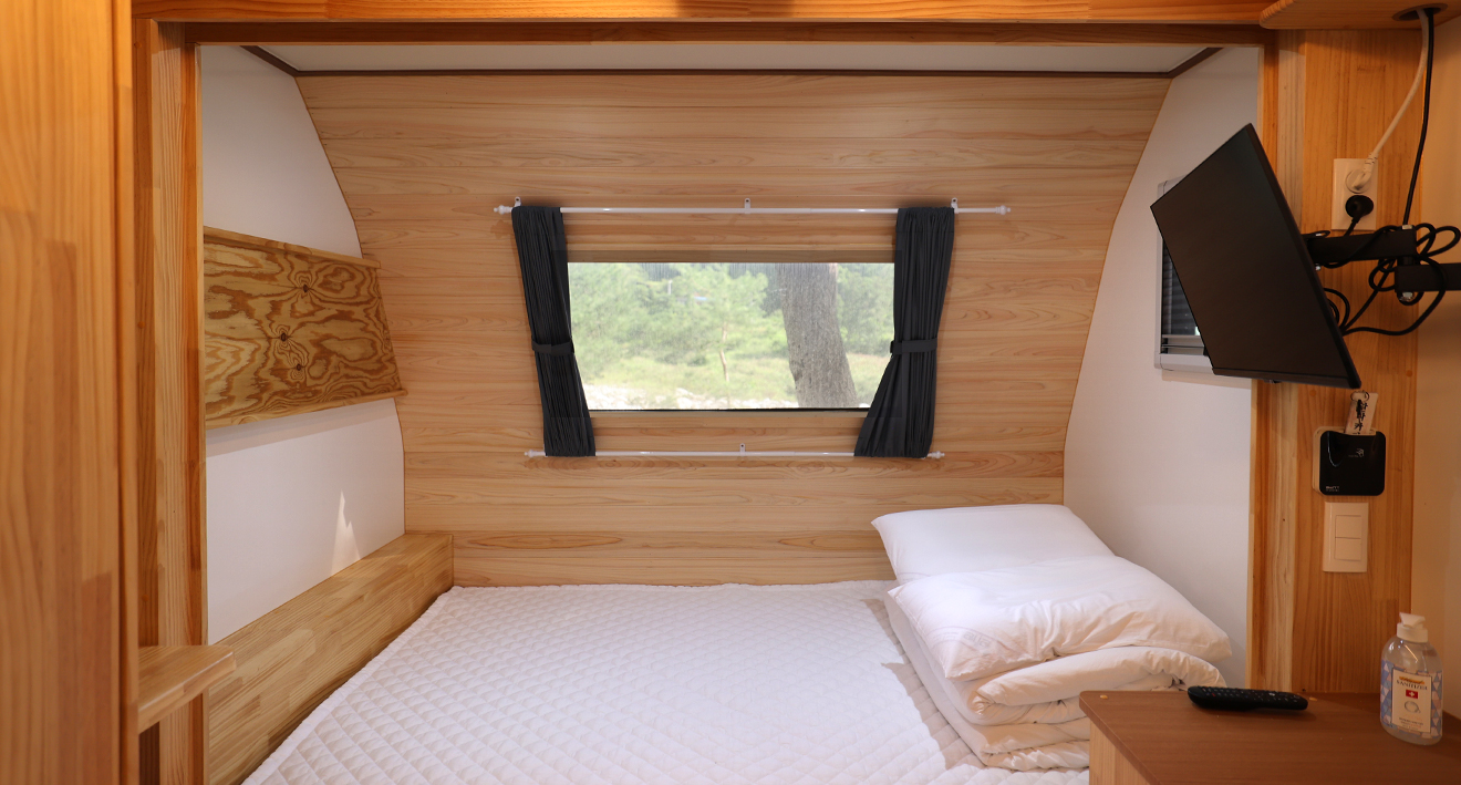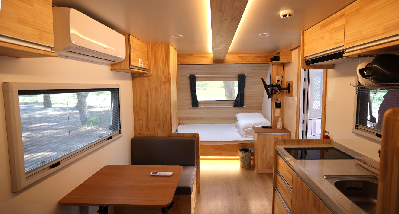 - 카라반 1대, 야외데크, 공용주차장, 기본집기류(숟가락, 가위, 칼, 냄비 등)